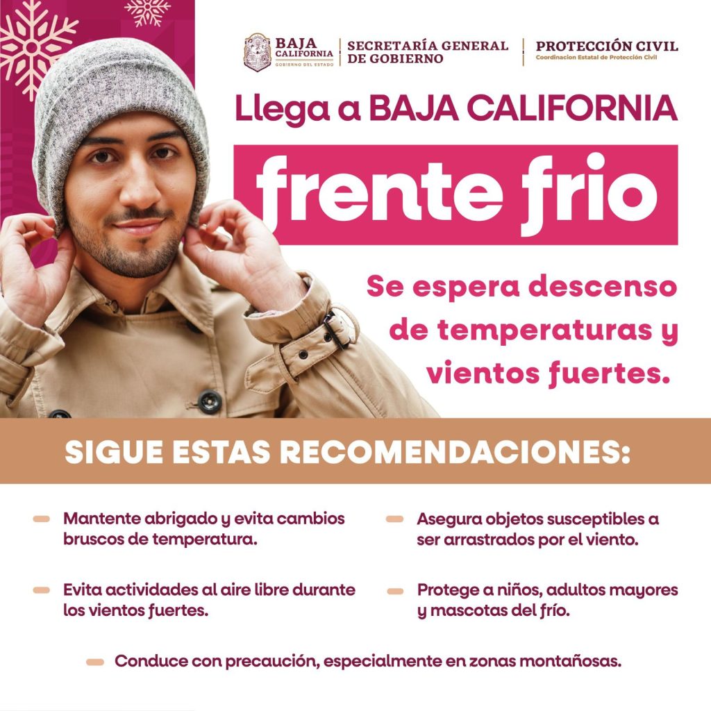 ⚠️ Protección Civil Baja California informa sobre la llegada del frente frío número 23, que traerá bajas temperaturas de hasta -10 °C en zonas montañosas y fuertes vientos de 40 a 60 kilómetros por hora. Estas condiciones aumentan el riesgo de incendios forestales.