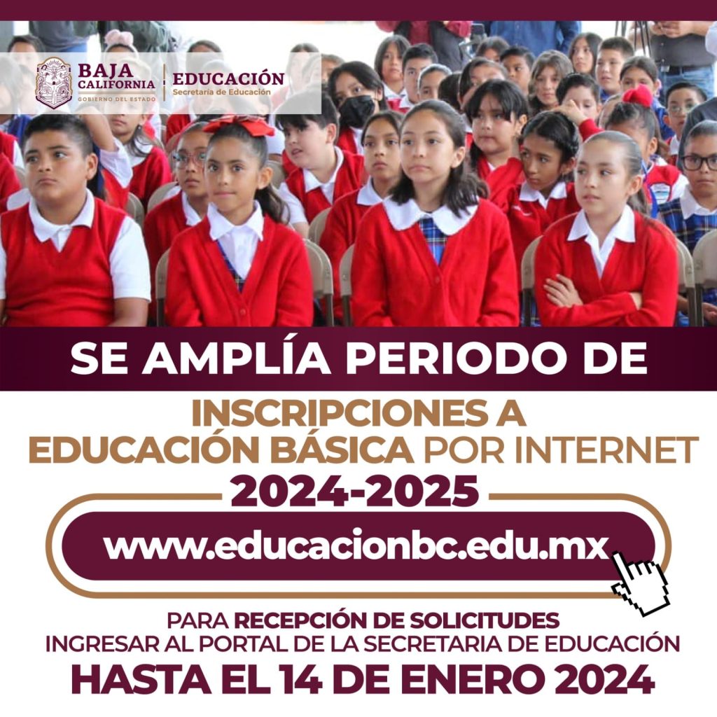 MEXICALI.- La presente administración estatal a cargo de la Gobernadora Marina del Pilar Ávila Olmeda, a través de la Secretaría de Educación, informa a los padres de familia y a la comunidad en general que con el objetivo de garantizar el acceso a la educación a los niños, niñas y adolescentes en Baja California, se ampliará hasta el domingo 14 de enero del 2024 el periodo de registro de solicitudes de inscripción en Educación Básica para el ciclo escolar 2024-2025, en el portal oficial www.educacionbc.edu.mx.