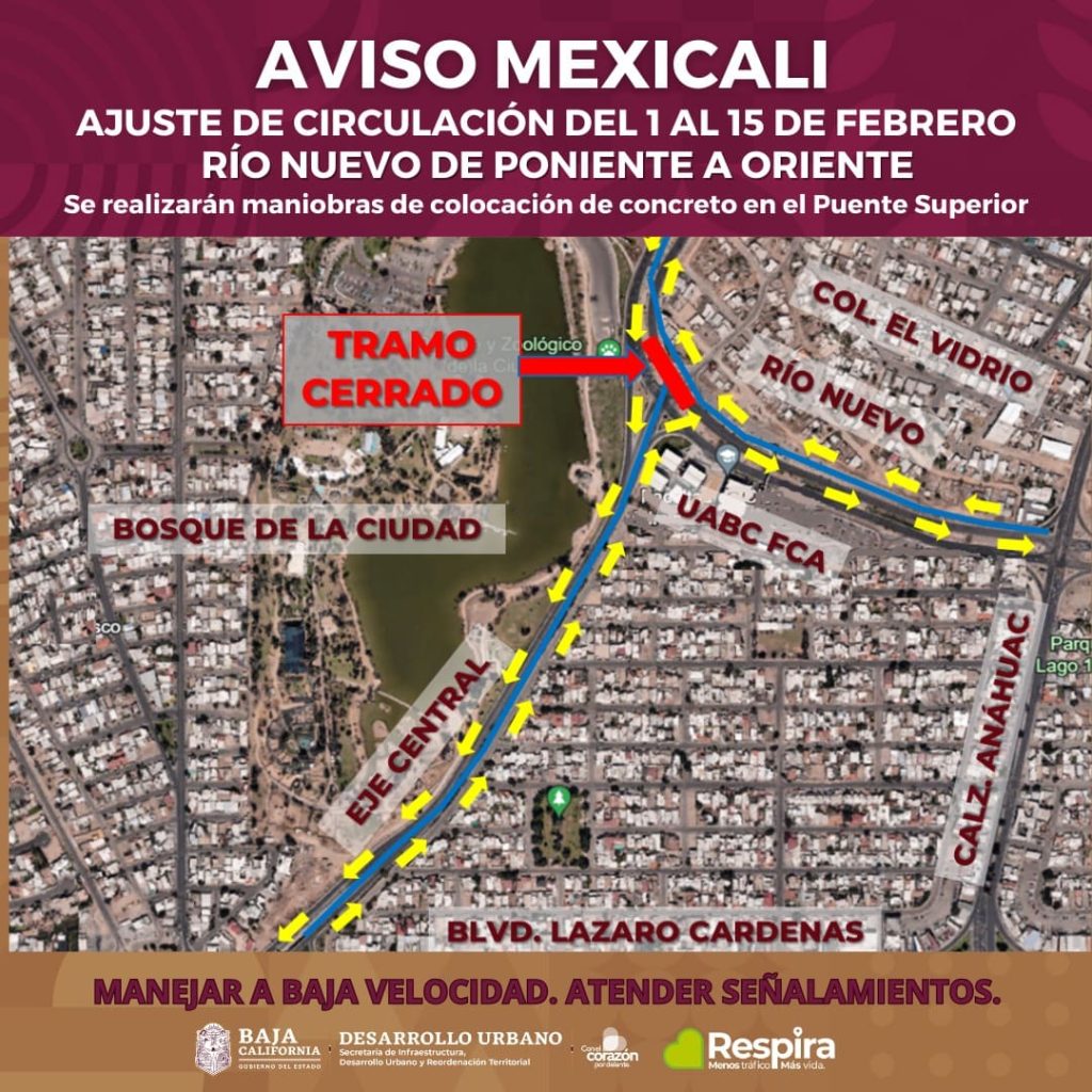 MEXICALI.- La Secretaría de Infraestructura, Desarrollo Urbano y Reordenación Territorial (SIDURT), llevará a cabo un ajuste en la circulación a partir del jueves 1 de febrero sobre el Río Nuevo en dirección Poniente a Oriente, hacia la calzada Anáhuac con el finalidad de realizar trabajos de colocación de concreto en el puente secundario que se construye sobre esta vialidad.