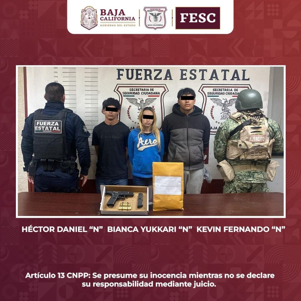 MEXICALI.- Agentes de la Fuerza Estatal de Seguridad Ciudadana (FESC) en un trabajo coordinado con la Secretaría de la Defensa Nacional (SEDENA) detuvieron a dos hombres y una mujer que protagonizaron una persecución y choque en la zona de Valle de Mexicali; se les aseguraron un arma de fuego abastecida y varias dosis de la droga sintética conocida como metanfetamina, motivo por el cual fueron turnados a la Fiscalía General de la República (FGR).