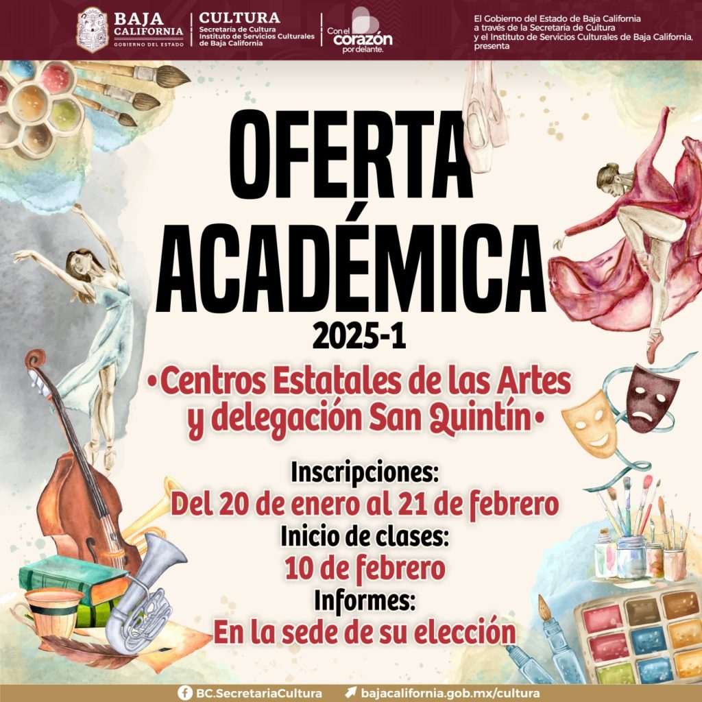 *Las inscripciones estarán abiertas del 20 de enero al 21 de febrero de 2025 en los cinco Centros Estatales de las Arteds (CEART), así como en la Biblioteca Central Estatal de Mexicali a partir del 27 de enero.