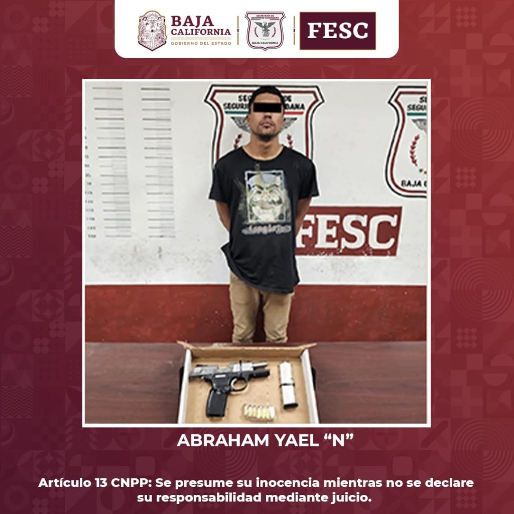 MEXICALI.- Un arma de fuego de calibre .45 mm fue retirada al conductor de un vehículo que fue intervenido en las inmediaciones de la colonia Conjunto Urbano Esperanza en la ciudad de Mexicali, por agentes de la Coordinación de Enlace Internacional de la Fuerza Estatal de Seguridad Ciudadana (FESC); el hombre de 27 años de edad, fue identificado como Abraham Yael “N”.