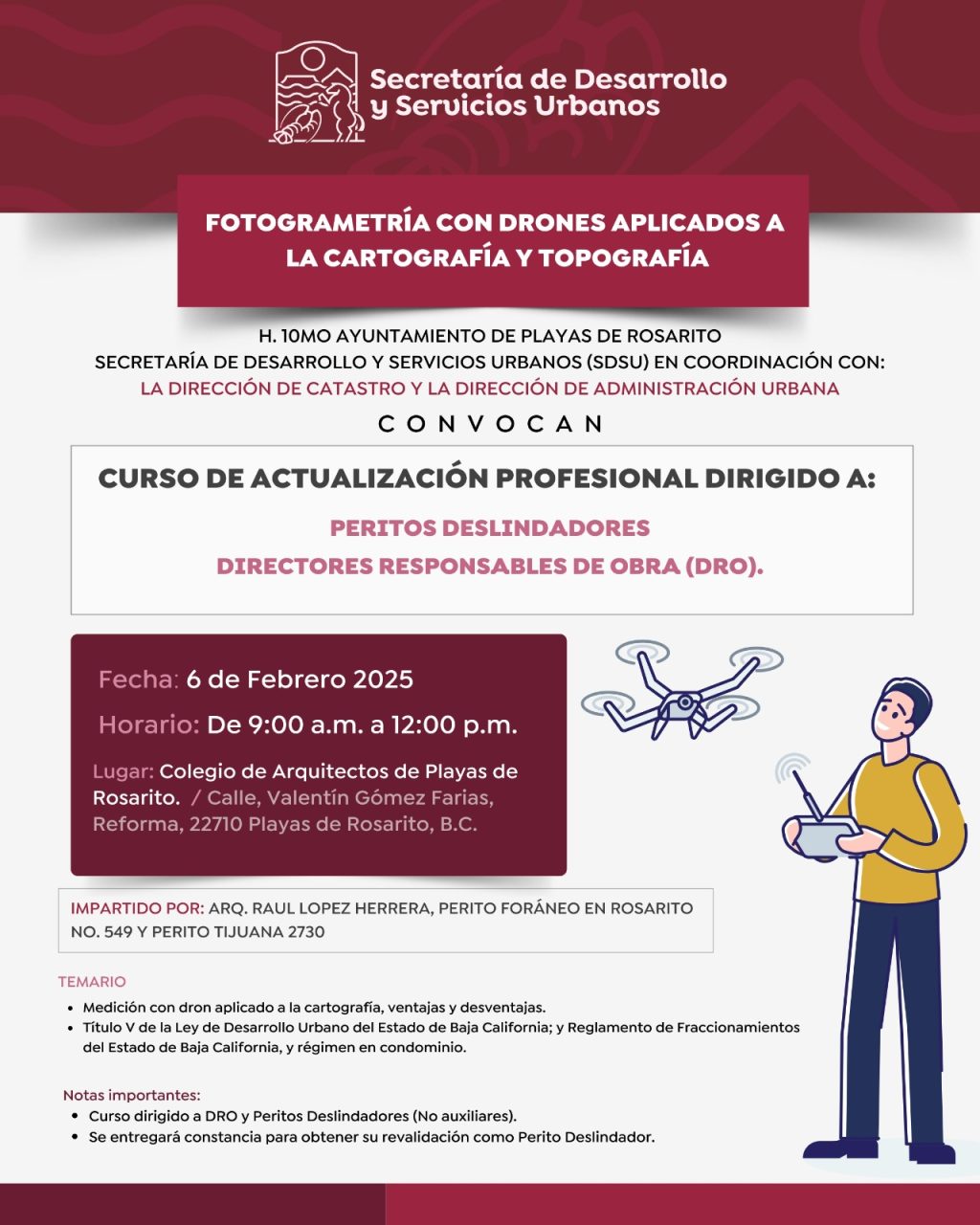 El titular de SDSU, Ing. Luis Fernando González Vergara, informó que, en coordinación con la Dirección de Catastro Municipal y Administración Urbana, se llevará esta capacitación gratuita, titulada “Fotogramétrica con drones aplicados a la cartografía y topografía”, el próximo 6 de febrero, de las 9:00 a las 12:00 horas, en el Colegio de Arquitectos de Playas de Rosarito, ubicado en la calle Valentín Gómez Farías, Reforma 22710.