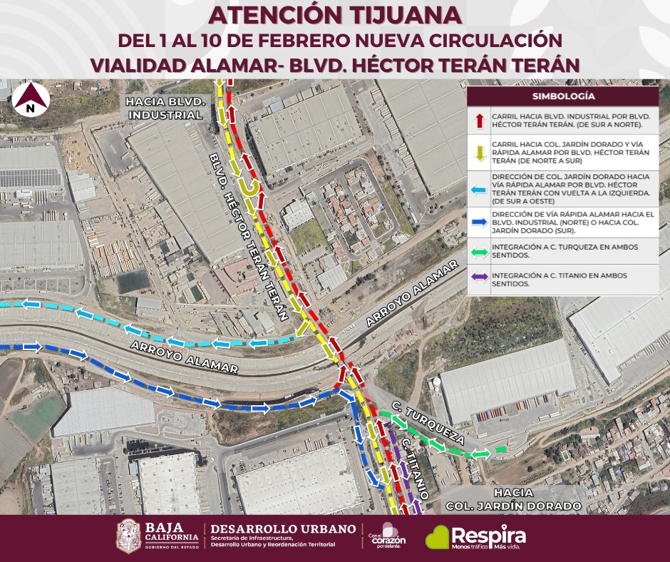 TIJUANA.- La Secretaría de Infraestructura, Desarrollo Urbano y Reordenación Territorial (SIDURT) informa que a partir de las siete de la mañana del jueves primero de febrero, se hará un ajuste en la circulación en el Nodo Alamar -Terán Terán, con motivo del temporal de lluvias que se pronostica para el municipio.