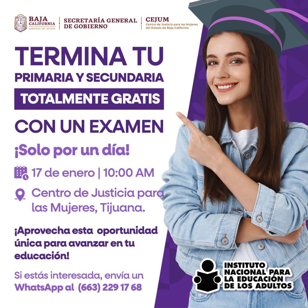 El exámen se llevará a cabo el 17 de enero a las 10:00 horas en las instalaciones del Centro de Justicia para las Mujeres en Tijuana. Las interesadas podrán tomar el examen que les permitirá concluir su primaria o secundaria, un paso importante hacia su desarrollo personal y profesional.