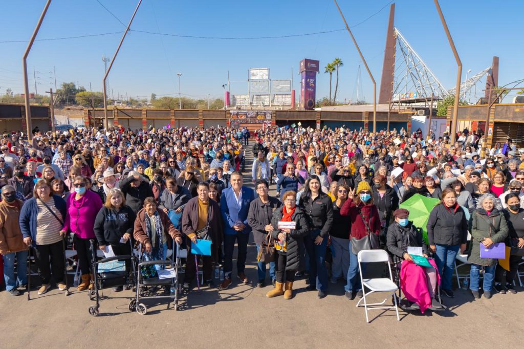 **Derivado de ello, la presidenta y la secretaria del Bienestar Ariadna Montiel Reyes impulsan la Pensión Mujeres Bienestar, con la entrega de tres mil 127 tarjetas en Mexicali, para igual número de derechohabientes